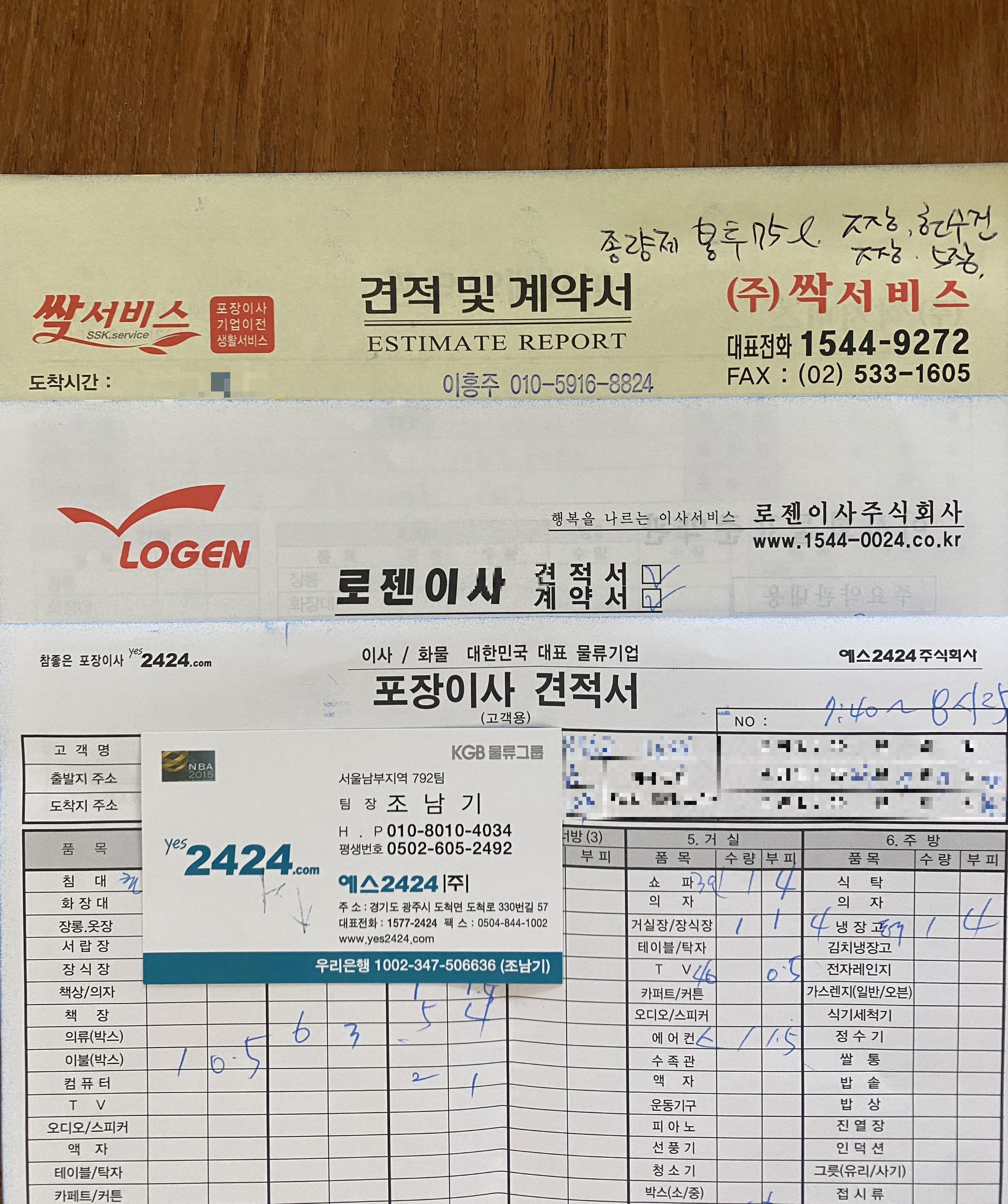 갑작스러운 이사결정으로 급히 이사업체 방문견적을 알아봤다. 결혼 후 첫 이사라 아는 업체도 없어서 지역 맘카페와 포털 검색으로 싹서비스, 로젠이사, YES2424 이렇게 3개 업체를 추려서 방문견적을 받았다.